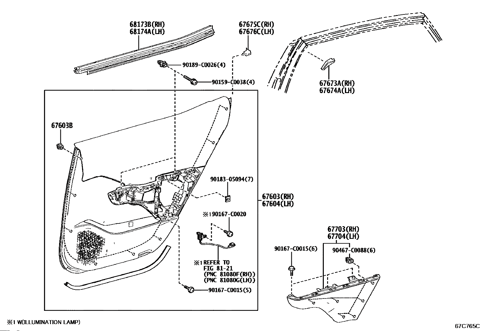 【67673A】6767303010 GARNISH, REAR DOOR FRAME, RH